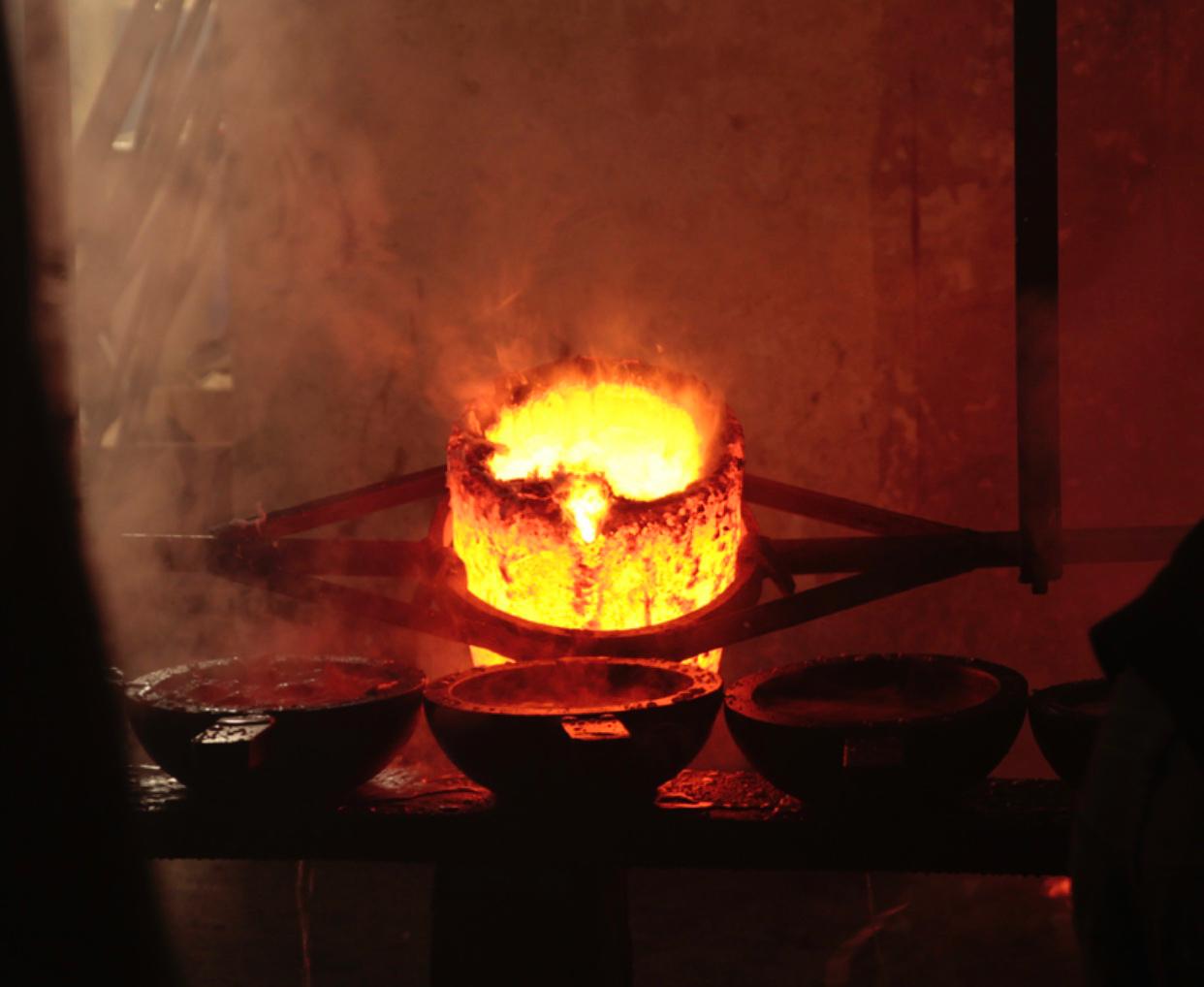 80 kilo crucible is taken to the cast area and start casting into warm water